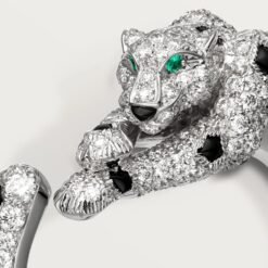 Introducing the exquisite Panthère de Cartier hoop earrings, a luxurious embodiment of elegance and craftsmanship. Crafted in 18K white gold, these earrings captivate with their distinctive design, featuring the mesmerizing eyes of two emeralds, 21 sleek onyx spots, and a single onyx nose that adds a bold touch.