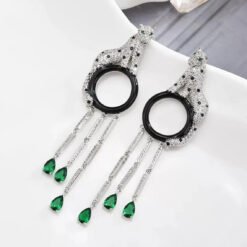 Each earring is a work of art, featuring a pavé-set panther that rests upon a sleek onyx hoop. The design is further enhanced by three articulated pendants, each set with sparkling diamonds and culminating in drop-shaped emerald beads. These spectacular earrings embody Cartier’s timeless craftsmanship and are a bold statement of sophistication and allure.