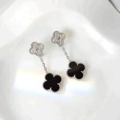 Discover the enchanting allure of the Magic Alhambra earrings, featuring two motifs exquisitely crafted in rhodium-plated 18K white gold. These captivating earrings are adorned with 24 dazzling round diamonds totaling 0.96 carats, showcasing impeccable DEF, IF to VVS diamond quality.